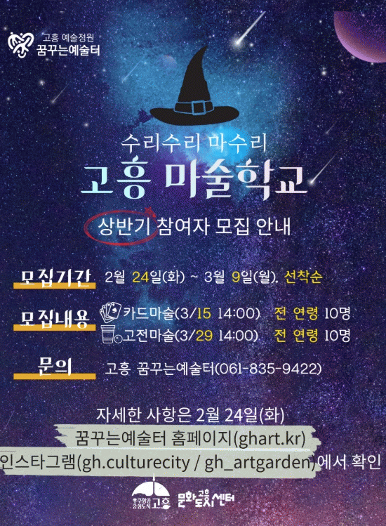 [ÅåÅå´º½º]°íÈﱺÀº ¸¶¼úÀ» ¸Å°³·Î âÀǷ°ú ÁýÁß·Â, ÀڽۨÀ» ±â¸¦ ¼ö Àִ üÇèÇü ¹®È¿¹¼ú±³À° ÇÁ·Î±×·¥ÀÎ ¡®¼ö¸®¼ö¸® ¸¶¼ö¸® '°íÈï ¸¶¼úÇб³'¡¯ÀÇ »ó¹Ý±â Âü¿©ÀÚ¸¦ ¸ðÁýÇÑ´Ù.