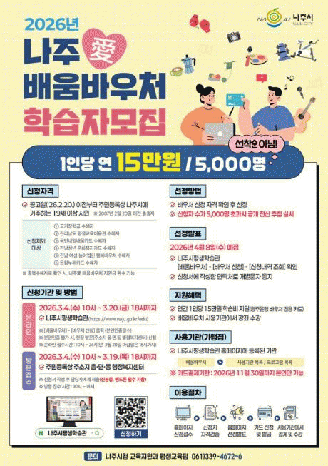 [ÅåÅå´º½º]Àü¶ó³²µµ ³ªÁֽ𡠽ùÎÀÇ Æò»ýÇнÀ±Ç º¸Àå°ú ÀÚ±â°è¹ß Áö¿øÀ» À§ÇØ 5õ ¸í ±Ô¸ðÀÇ ¡®2026³â ³ªÁÖ¾Ö(äñ)¹è¿ò¹Ù¿ì󡯸¦ º»°Ý ¿î¿µÇϸç ü°¨Çü Æò»ý±³À° Çõ½ÅÁ¤Ã¥À» À̾´Ù.