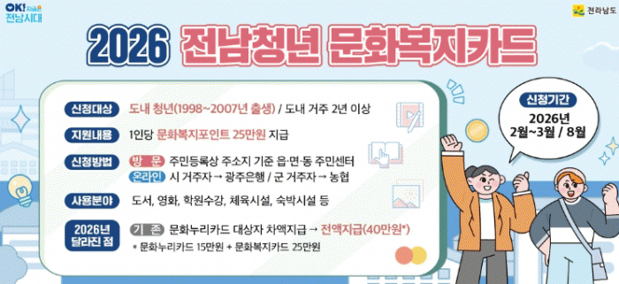 [ÅåÅå´º½º]Àü¶ó³²µµ°¡ Áö¿ª û³âÀÇ ¹®È ÇâÀ¯¿Í ÀÚ±â°è¹ß ±âȸ¸¦ ³ÐÈ÷±â À§ÇØ 19~28¼¼ û³â¿¡°Ô ¿¬ 25¸¸ ¿øÀ» Áö¿øÇÏ´Â ¡®Àü³² û³â ¹®Èº¹ÁöÄ«µå¡¯ ½ÅûÀ» 3¿ù ¸»±îÁö Á¢¼öÇÑ´Ù.