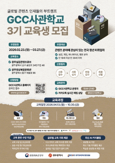 [ÅåÅå´º½º]±¤ÁÖ±¤¿ª½Ã´Â ¹®ÈÄÜÅÙÃ÷ »ê¾÷À» ¼±µµÇÒ Àü¹®Àη ¾ç¼ºÀ» À§ÇØ ¡®GCC»ç°üÇб³¡¯ 3±â ±³À°»ý 100¸íÀ» ¿À´Â 3¿ù27ÀϱîÁö ¸ðÁýÇÑ´Ù.