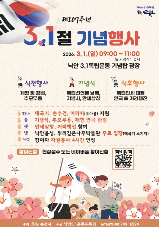 [ÅåÅå´º½º]¼øÃµ½Ã´Â ¿À´Â 3¿ù 1ÀÏ ¿ÀÀü 10½Ã, ³«¾È3.1µ¶¸³¿îµ¿±â³äž ±¤Àå¿¡¼ Á¦107ÁÖ³â 3.1Àý ±â³äÇà»ç¸¦ °³ÃÖÇÑ´Ù°í ¹àÇû´Ù.