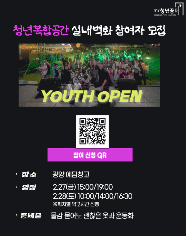 ÇÑÆí, û³âº¹ÇÕ°ø°£ ½Ç³»º®È ÇÁ·ÎÁ§Æ® Âü¿©ÀÚ ¸ðÁý°ú °ü·ÃµÈ ÀÚ¼¼ÇÑ »çÇ×Àº ±¤¾çû³â²ÞÅÍ ´©¸®Áý ¶Ç´Â ÀüÈ ¹®ÀǸ¦ ÅëÇØ È®ÀÎÇÒ ¼ö ÀÖ´Ù.