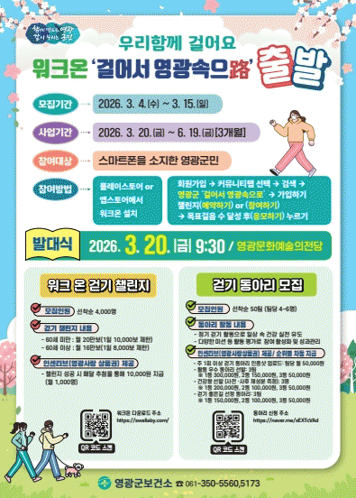 [ÅåÅå´º½º]¿µ±¤±ºÀº ±º¹ÎµéÀÇ ½ÅüȰµ¿À» Àå·ÁÇÏ°í ºñ¸¸ ¿¹¹æ ¹× ¸¸¼ºÁúȯÀ» °ü¸®Çϱâ À§ÇØ ¸ð¹ÙÀÏ °È±â ¾Û '¿öÅ©¿Â(Walk On)'ÀÇ ¸ð¹ÙÀÏ Ä¿¹Â´ÏƼ '°É¾î¼ ¿µ±¤¼ÓÀ¸ÖØ¡¯Âü¿©ÀÚ ¹× °È±â µ¿¾Æ¸®¸¦ 3¿ù 4ÀϺÎÅÍ 3¿ù 15ÀϱîÁö ¸ðÁýÇÑ´Ù°í ¹àÇû´Ù.