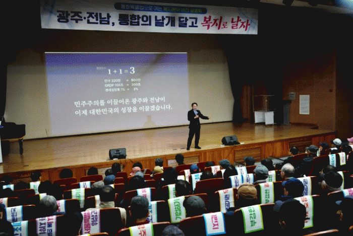 °±âÁ¤ ½ÃÀåÀº ¡°±¤ÁÖÀü³²ÀÇ ÅëÇÕÀº ´Ü¼øÈ÷ ÇàÁ¤±¸¿ªÀ» ÇÕÄ¡´Â Â÷¿øÀ» ³Ñ¾î ½Ã¹ÎÀÇ »îÀÇ ÁúÀ» ¹Ù²Ù´Â ¼±Åá±À̶ó¸ç ¡°ÅëÇÕÀ» ÅëÇØ ¼öµµ±Ç¿¡ ´ëÀÀÇÏ´Â Ãʱ¤¿ª »ê¾÷ Á߽ɵµ½Ã¸¦ ¸¸µé°í, ¡®ÀÎ(In)¼¿ï¡¯ÀÌ ¾Æ´Ñ ¡®ÀÎ(In)±¤ÁÖ, ÀÎ(In)Àü³²¡¯ÀÇ ½Ã´ë¸¦ ¿°Ú´Ù¡±°í °Á¶Çß´Ù.