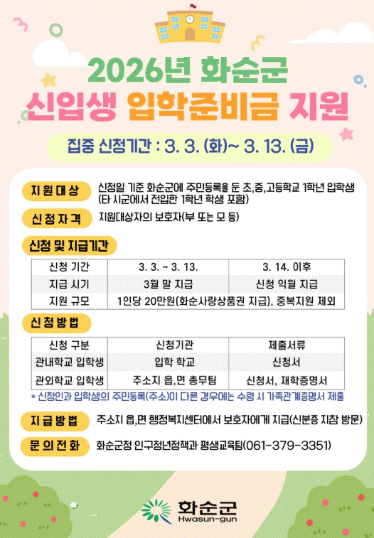 [ÅåÅå´º½º]ȼø±ºÀº 2026Çг⵵ ÃÊ¡¤Áß¡¤°íµîÇб³ ½ÅÀÔ»ý °¡Á¤ÀÇ ±³À°ºñ ºÎ´ãÀ» ¿ÏÈÇÏ°í º¸ÆíÀû ±³À°º¹Áö¸¦ ½ÇÇöÇϱâ À§ÇØ ÀÔÇÐÁغñ±Ý 1Àδç 20¸¸ ¿øÀ» ȼø»ç¶û»óǰ±ÇÀ¸·Î Áö¿øÇÑ´Ù°í 27ÀÏ ¹àÇû´Ù.