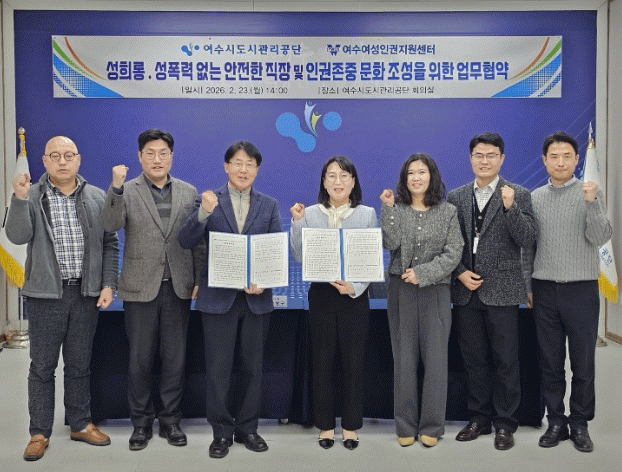 [ÅåÅå´º½º]¿©¼ö½Ãµµ½Ã°ü¸®°ø´ÜÀº ¼ºÆòµîÇÑ Á¶Á÷¹®È Á¤Âø°ú ÀαÇÄ£ÈÀû °ø°ø½Ã¼³ Á¶¼ºÀ» À§ÇØ ¿©¼ö¿©¼ºÀαÇÁö¿ø¼¾ÅÍ(¼¾ÅÍÀå À±Àº¹Ì), ¿©¼ö½Ã ¿©¼ºÄ£Èµµ½Ã ½Ã¹ÎÂü¿©´Ü À§ÇÏ´ÙWE_ÇÏ´Ù(´ÜÀå ÀÌÇö¿µ)¿Í ÀÕ´Þ¾Æ ¾÷¹«Çù¾àÀ» ü°áÇß´Ù°í 27ÀÏ ¹àÇû´Ù.