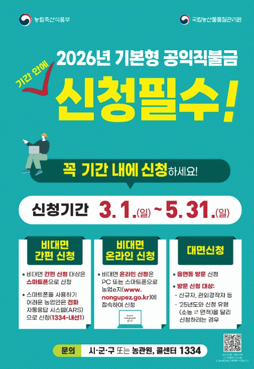 [ÅåÅå´º½º]±¤¾ç½Ã´Â ³ó¾÷¡¤³óÃÌÀÇ °øÀͱâ´ÉÀ» ÁõÁøÇÏ°í ³ó¾÷ÀÎÀÇ ¼Òµæ ¾ÈÁ¤À» µµ¸ðÇϱâ À§ÇØ 3¿ù 1ÀϺÎÅÍ 5¿ù 31ÀϱîÁö ¡®2026³â ±âº»Çü °øÀÍÁ÷ºÒÁ¦¡¯ Á¢¼ö¸¦ ½Ç½ÃÇÑ´Ù.