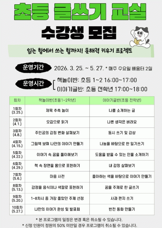 Ã¥³îÀ̹ÝÀº ´Ù¾çÇÑ Ã¥³îÀÌ Áß½É È°µ¿À» ÅëÇØ ±âÃÊ ¹®ÇØ·ÂÀ» ÀÚ¿¬½º·´°Ô ÀÍÈ÷µµ·Ï µ½°í, À̾߱â±Û¹ÝÀº ÁÖÁ¦ ޱ¸¿Í ±Û¾²±â Ȱµ¿À» ÅëÇØ »ç°í·Â°ú Ç¥Çö·Â Çâ»ó¿¡ ÁßÁ¡À» µÎ°í ¿î¿µµÉ ¿¹Á¤ÀÌ´Ù.