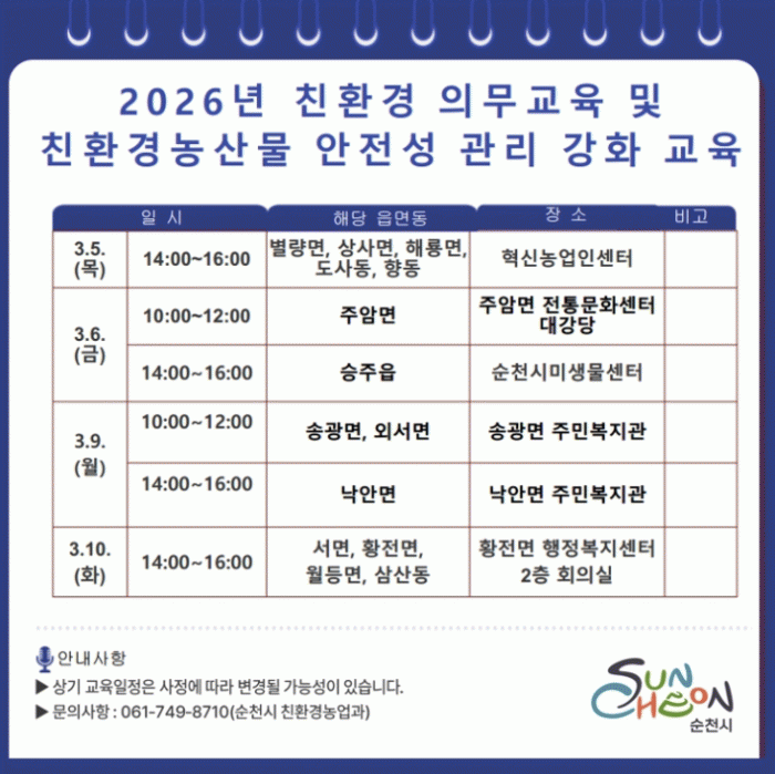[ÅåÅå´º½º]¼øÃµ½Ã´Â ¿À´Â 5ÀϺÎÅÍ 10ÀϱîÁö ÃÑ 6ȸ¿¡ °ÉÃÄ Çõ½Å³ó¾÷Àμ¾ÅÍ¿Í ÇàÁ¤º¹Áö¼¾ÅÍ µî¿¡¼ ģȯ°æ ³ó»ê¹°À» »ý»êÇÏ´Â ³ó¾÷ÀÎ 1,200¿© ¸íÀ» ´ë»óÀ¸·Î ¡®Ä£È¯°æ³ó¾÷ Àǹ«±³À° ¹× ģȯ°æ³ó»ê¹° ¾ÈÀü¼º °ü¸® °È ±³À°¡¯À» ½Ç½ÃÇÑ´Ù°í ¹àÇû´Ù.