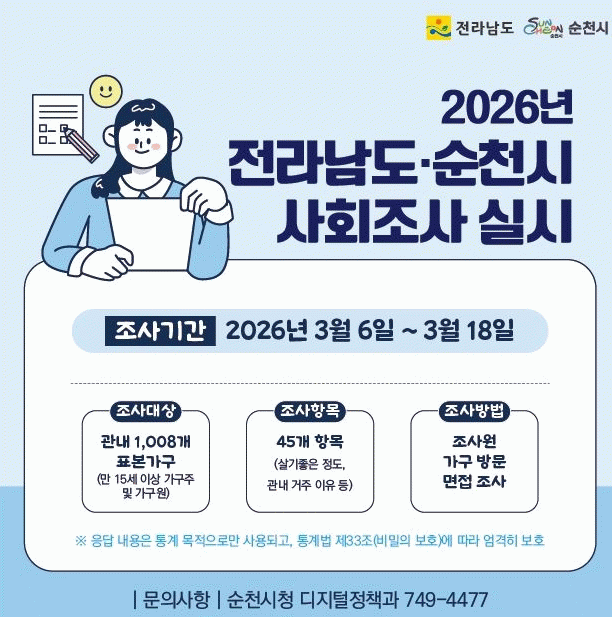 [ÅåÅå´º½º]¼øÃµ½Ã´Â ½Ã¹ÎµéÀÇ »îÀÇ ÁúÀû ¼öÁذú »çȸ »óÅÂÀÇ º¯È¸¦ ÆÄ¾ÇÇϱâ À§ÇØ ¿À´Â 6ÀϺÎÅÍ 13Àϰ£ 2026³â »çȸÁ¶»ç¸¦ ½Ç½ÃÇÑ´Ù°í ¹àÇû´Ù.