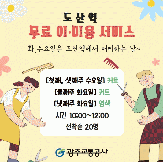 [ÅåÅå´º½º]±¤ÁÖ±³Åë°ø»ç(»çÀå ¹®¼®È¯)´Â ±¤»ê±¸ÀÚ¿øºÀ»ç¼¾ÅÍ(ÀÌ»çÀå ¹Úº´±â)¿Í ÇÔ²² Áö¿ª»çȸ »ó»ý°ú ³ª´® ½ÇõÀ» À§ÇØ 3¿ùºÎÅÍ 11¿ù±îÁö ±¤»ê±¸ µµ»ê¿ª¿¡¼ Áö¿ª ÁÖ¹ÎÀ» ´ë»óÀ¸·Î ¹«·á ÀÌ¡¤¹Ì¿ë ¼ºñ½º¸¦ ¿î¿µÇÑ´Ù.