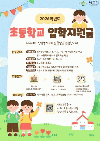 ³ªÁֽô 2026³â ÃʵîÇб³ ÀÔÇÐÀÏÀÎ 3¿ù 3ÀÏ ±âÁØ ³ªÁֽÿ¡ Áֹεî·ÏÀ» µÎ°í °è¼Ó °ÅÁÖÇÏ¸é¼ °ü³» ÃʵîÇб³¿¡ ÃÖÃÊ ÀÔÇÐÇÏ´Â ½ÅÀÔ»ýÀ» ´ë»óÀ¸·Î ÀÔÇÐÁö¿ø±ÝÀ» Áö¿øÇÑ´Ù°í 5ÀÏ ¹àÇû´Ù.