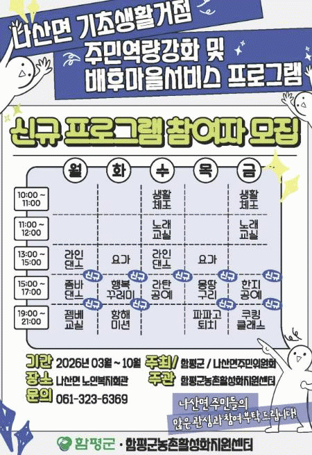 À̹ø ÇÁ·Î±×·¥Àº ³ª»ê¸é ±âÃÊ»ýȰ°ÅÁ¡ Á¶¼º»ç¾÷ÀÇ ÀÏȯÀ¸·Î, ÁֹΠ»îÀÇ Áú Çâ»ó°ú Áö¿ª °øµ¿Ã¼ Ȱ¼ºÈ¸¦ À§ÇØ ¸¶·ÃµÆ´Ù.