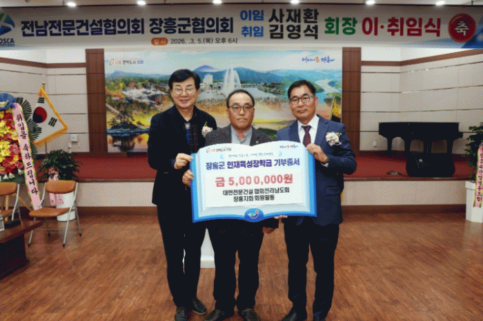 [ÅåÅå´º½º](Àç)ÀåÈﱺÀÎÀçÀ°¼ºÀåÇÐȸ´Â ´ëÇÑÀü¹®°Ç¼³Çùȸ Àü¶ó³²µµÈ¸ ÀåÈïÁöȸ ȸ¿ø Àϵ¿ÀÌ Áö¿ª ÀÎÀç À°¼ºÀ» À§ÇÑ ÀåÇÐ±Ý 500¸¸ ¿øÀ» ±âºÎÇß´Ù°í ¹àÇû´Ù.
