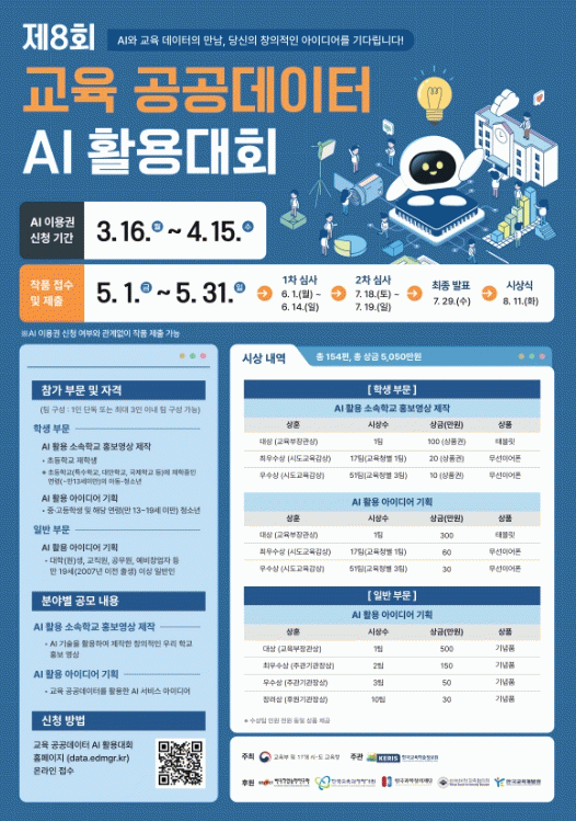 AI ÀÌ¿ë±Ç ½ÅûÀº ¿À´Â 16ÀϺÎÅÍ ´ÙÀ½´Þ 15ÀϱîÁö, ÀÛǰ Á¦ÃâÀº 5¿ù 1ÀϺÎÅÍ 5¿ù 31ÀϱîÁö ±³À° °ø°øµ¥ÀÌÅÍ ºÐ¼®È°¿ë´ëȸ ´©¸®Áý(data.edmgr.kr)À» ÅëÇØ ÇÏ¸é µÈ´Ù.
