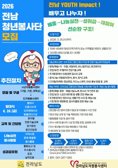[ÅåÅå´º½º]°Áø±ºÀÌ Áö¿ª »çȸ¿¡ Ȱ·ÂÀ» ºÒ¾î³Ö°í û³âÀÇ »çȸÂü¿© ±âȸ¸¦ È®´ëÇϱâ À§ÇØ ¡®Àü³² û³âºÀ»ç´Ü¡¯À» ¿À´Â 20ÀϱîÁö ¸ðÁýÇÑ´Ù.