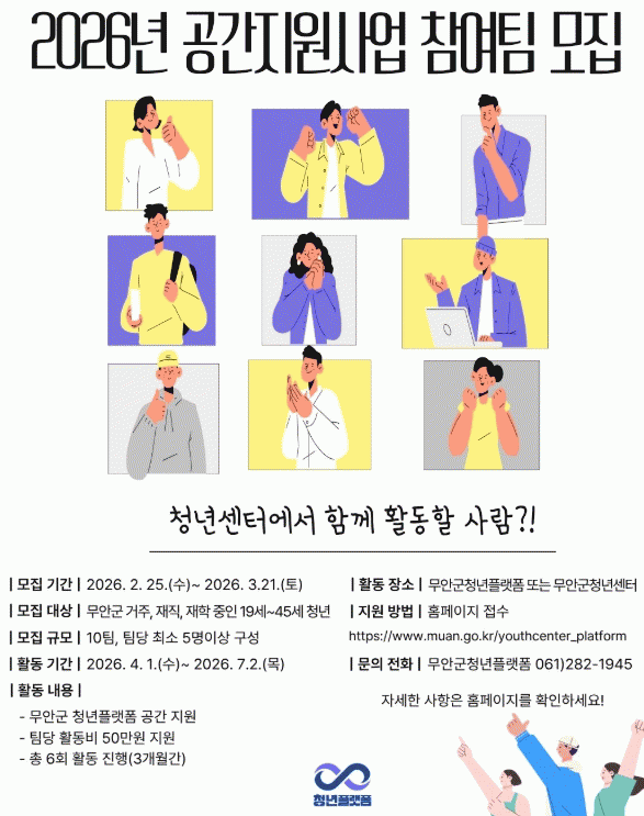 [ÅåÅå´º½º]¹«¾È±ºÃ»³âÇ÷§ÆûÀº û³âµéÀÇ ´Ù¾çÇÑ ¸ðÀÓ È°µ¿À» Áö¿øÇϰí û³â¼¾ÅÍ °ø°£ Ȱ¿ëÀ» Ȱ¼ºÈÇϱâ À§ÇØ ¡®2026³â °ø°£Áö¿ø »ç¾÷¡¯ Âü¿©ÆÀÀ» ¸ðÁýÇÑ´Ù°í ¹àÇû´Ù.