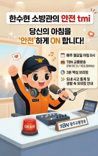 ¡®ÇѼöÇö ¼Ò¹æ°üÀÇ ¾ÈÀü tmi¡¯´Â TBN ±¤ÁÖ±³Åë¹æ¼Û(Àü³² ¼ºÎ±Ç¡¤±¤ÁÖ FM 97.3MHz, Àü³² µ¿ºÎ±Ç FM 103.5MHz)À» ÅëÇØ ¸ÅÁÖ ¿ù¿äÀÏ ¾ÆÄ§ 8½Ã¿¡ ûÃëÇÒ ¼ö ÀÖ´Ù.