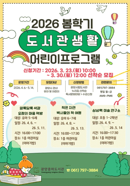 [ÅåÅå´º½º] ±¤¾çÁ߸¶µµ¼°üÀº ¿À´Â 4¿ù 6ÀϺÎÅÍ 5¿ù 14ÀϱîÁö 6ÁÖ°£ À¯¾Æ(5~7¼¼)¿Í ÃʵîÇб³ 1~2ÇгâÀ» ´ë»óÀ¸·Î º½ Çб⠾ÀÌ ÇÁ·Î±×·¥¿¡ Âü¿©ÇÒ ¼ö°»ýÀ» ¸ðÁýÇÑ´Ù°í ¹àÇû´Ù.