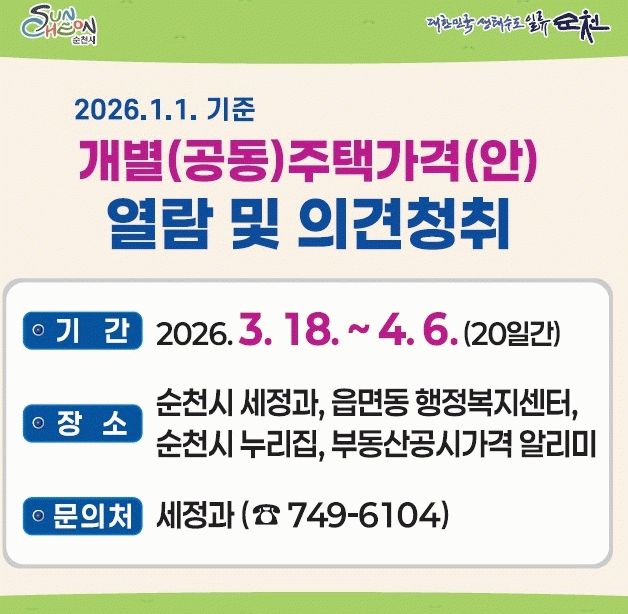 [ÅåÅå´º½º] ¼øÃµ½Ã´Â 1¿ù 1ÀÏ ±âÁØ °³º°(°øµ¿)ÁÖÅà °¡°Ý ¿¶÷ ¹× ÀǰßÁ¦Ã⠱ⰣÀ» 3¿ù 18ÀϺÎÅÍ 4¿ù 6ÀϱîÁö ¿î¿µÇÑ´Ù°í ¹àÇû´Ù.