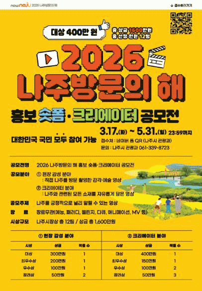 [ÅåÅå´º½º]Àü³² ³ªÁֽð¡ ¼ôÆû ¿µ»ó ÄÜÅÙÃ÷ °ø¸ðÀüÀ» ÅëÇØ ¡®2026 ³ªÁֹ湮ÀÇ ÇØ¡¯ ÃàÁ¦¿Í ¹®È, °ü±¤ÀÚ¿øÀ» Àü±¹¿¡ ³Î¸® ¾Ë¸®´Â È«º¸¿¡ ³ª¼±´Ù.