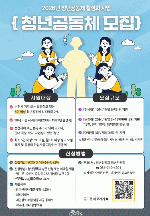 [ÅåÅå´º½º] ¼øÃµ½Ã´Â û³âµéÀÇ ¾ÆÀ̵ð¾î¿Í ÄÜÅÙÃ÷·Î Áö¿ª ³»¿¡¼ ÆîÄ¡´Â ´Ù¾çÇÑ È°µ¿À» Áö¿øÇÏ´Â 2026³â ¡¸Ã»³â°øµ¿Ã¼ Ȱ¼ºÈ »ç¾÷¡¹ÀÇ Âü¿© °øµ¿Ã¼¸¦ ¸ðÁýÇÑ´Ù°í ¹àÇû´Ù.