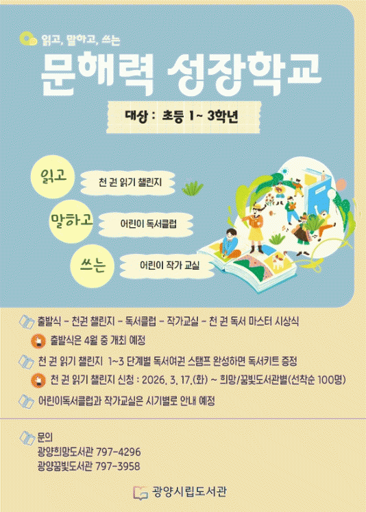[ÅåÅå´º½º] ±¤¾ç½Ã´Â ¾î¸°À̵éÀÇ ±âÃÊÇнÀ ¿ª·®ÀÎ ¹®ÇØ·ÂÀ» ³ôÀ̱â À§ÇØ 4¿ùºÎÅÍ ±¤¾çÈñ¸Áµµ¼°ü°ú ±¤¾ç²Þºûµµ¼°ü¿¡¼ ¡®¹®ÇØ·Â ¼ºÀåÇб³¡¯¸¦ ¿î¿µÇÑ´Ù.