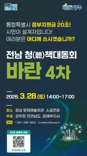 À̹ø ¡®¹Ù¶õ¡¯Àº ¡®20Á¶ ½Ã¹Î°øµ¿Ã¼ Æ÷·³¡¯ÀÇ Ãâ¹ß ½ÅÈ£´Ù. Àü³²µµ´Â Àü³²¡¤±¤ÁÖ ÅëÇÕÆ¯º°½Ã Ãâ¹üÀ» ¾ÕµÎ°í, Á¤ºÎ Áö¿ø 20Á¶ ¿ø ÀçÁ¤ÀÇ È°¿ë ¹æÇâÀ» ½Ã¡¤µµ¹Î°ú ÇÔ²² ³íÀÇÇÏ´Â ¡®20Á¶ ½Ã¹Î°øµ¿Ã¼ Æ÷·³¡¯À» ½ÃÀÛÇÑ´Ù.