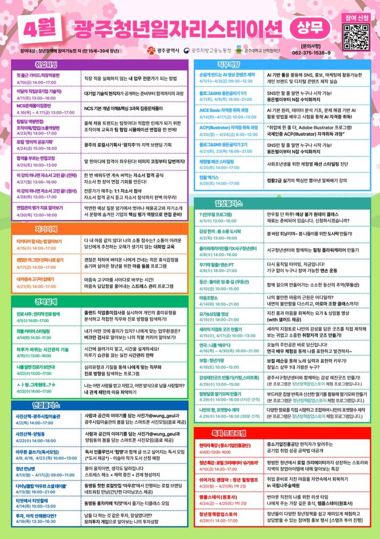 [ÅåÅå´º½º]±¤ÁÖ´ëÇб³ »êÇÐÇù·Â´ÜÀÌ À§Å¹ ¿î¿µÇÏ´Â ±¤ÁÖû³âÀÏÀÚ¸®½ºÅ×ÀÌ¼Ç »ó¹«¼¾ÅÍ(¼¾ÅÍÀå Á¶À¯±Ù, ±¤ÁÖ´ë ȸ°è¼¼¹«Çаú ±³¼ö)´Â 4¿ù Áö¿ª û³âÀ» ´ë»óÀ¸·Î Ãë¾÷¿ª·® °È¿Í ÀÚ±âÀÌÇØ, °æ·Â¼³°è¸¦ Áö¿øÇÏ´Â ´Ù¾çÇÑ ÇÁ·Î±×·¥À» ¿î¿µÇÑ´Ù.