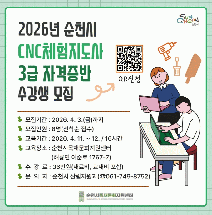 [ÅåÅå´º½º] ¼øÃµ½Ã´Â ¿À´Â 4¿ù 3ÀϱîÁö ¡®2026³â CNCüÇèÁöµµ»ç 3±Þ ÀÚ°ÝÁõ¹Ý¡¯ ±³À°»ýÀ» ¸ðÁýÇÑ´Ù°í ¹àÇû´Ù.