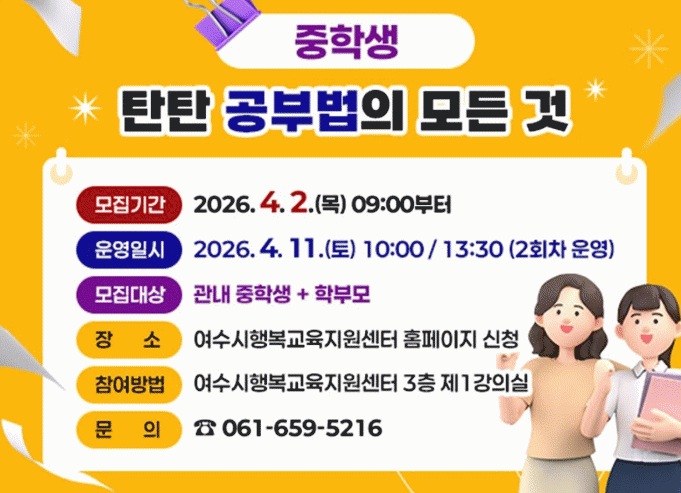 [ÅåÅå´º½º] ¿©¼ö½Ã°¡ ¿À´Â 4¿ù 11ÀÏ ¿©¼ö½ÃÇູ±³À°Áö¿ø¼¾ÅÍ¿¡¼ °ü³» ÁßÇлý°ú Çкθ𸦠´ë»óÀ¸·Î ¡®ÁßÇлý źź °øºÎ¹ýÀÇ ¸ðµç °Í¡¯ Ư°À» °³ÃÖÇÑ´Ù.