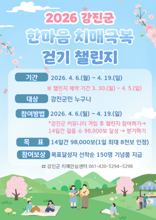 [ÅåÅå´º½º] °Áø±º º¸°Ç¼Ò(Ä¡¸Å¾È½É¼¾ÅÍ)°¡ Ä¡¸Å¿¹¹æ¿¡ ´ëÇÑ °ü½ÉÀ» ³ôÀÌ°í °Ç° »ýȰ ½ÇõÀ» µ¶·ÁÇϱâ À§ÇØ ¿À´Â 4¿ù 6ÀϺÎÅÍ 19ÀϱîÁö 14Àϰ£ 'ÇѸ¶À½ Ä¡¸Å±Øº¹ °È±â縰Áö'¸¦ ¿î¿µÇÑ´Ù.