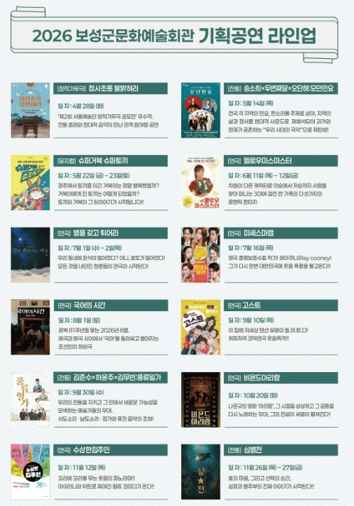 [ÅåÅå´º½º] º¸¼º±ºÀº 31ÀÏ º¸¼º±º¹®È¿¹¼úȸ°üÀÌ 2026³â ±âȹ °ø¿¬ ¶óÀξ÷À» È®Á¤Çϰí, °ø¸ð»ç¾÷ ¼±Á¤À» ÅëÇØ ±¹ºñ ÃÑ 2¾ï 2,400¿©¸¸ ¿øÀ» È®º¸Çß´Ù°í ¹àÇû´Ù.