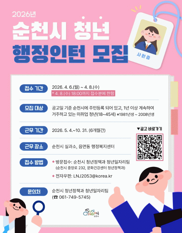 [ÅåÅå´º½º] ¼øÃµ½Ã´Â Áö¿ª û³âµéÀÇ Áø·Î ¼³°è¿¡ µµ¿òÀ» ÁÖ°í Ãë¾÷ °æÀï·ÂÀ» Ű¿ì´Â ½Ç¹« °æÇèÀ» Á¦°øÇϱâ À§ÇØ ¡®2026³â ¼øÃµ½Ã û³â ÇàÁ¤ÀÎÅÏ¡¯À» ¿î¿µÇÑ´Ù°í ¹àÇû´Ù.