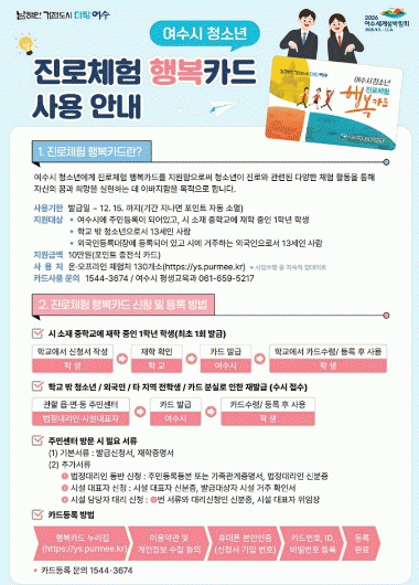 À̹ø »ç¾÷Àº ¿©¼ö½Ã¿¡ °ÅÁÖÇÏ´Â ÁßÇб³ 1Çгâ ÀçÇлý°ú 13¼¼ Çб³ ¹Û û¼Ò³âÀ» ´ë»óÀ¸·Î, 1ÀÎ´ç ¿¬°£ 10¸¸ ¿øÀ» ÃæÀü½Ä Æ÷ÀÎÆ® Ä«µå ÇüÅ·ΠÁö¿øÇÑ´Ù.