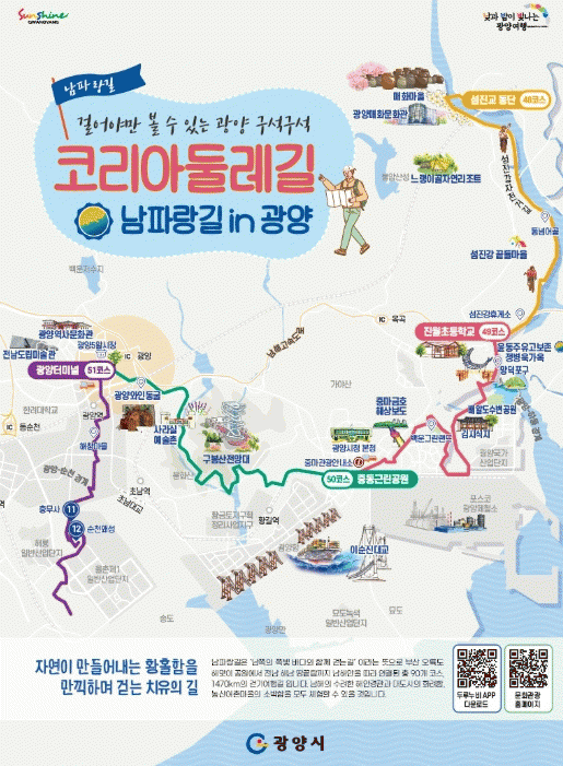 ÀÌ °¡¿îµ¥ ³²ÆÄ¶û±æÀº ºÎ»ê¿¡¼ ÇØ³²±îÁö ³²ÇؾÈÀ» µû¶ó À̾îÁö´Â ±¸°£À¸·Î, ÇØ¾È°ú µµ½Ã dz°æÀ» ÇÔ²² Áñ±æ ¼ö ÀÖ´Â °È±â ±æÀÌ´Ù.