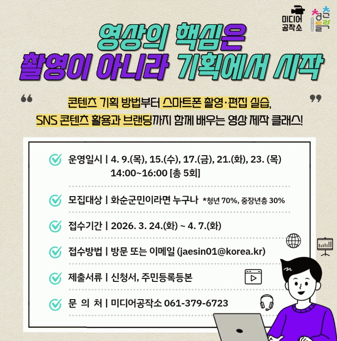 [ÅåÅå´º½º] ȼø±ºÀº ¿À´Â 4¿ù 9ÀÏ ¿ÀÈÄ 2½Ã ȼø±º û³â¼¾ÅÍ(ûÃáµé¶ô) ¹Ìµð¾î°øÀÛ¼Ò¿¡¼ ±º¹ÎÀ» ´ë»óÀ¸·Î ¿µ»ó Á¦ÀÛ ±³À°À» ¿î¿µÇÏ´Ù°í ¹àÇû´Ù.