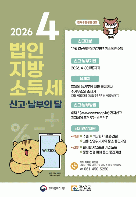 [ÅåÅå´º½º] Àü³² ¹«¾È±ºÀº ¹ýÀÎ ¼Òµæ¿¡ ´ëÇØ Áö¹æÀÚÄ¡´Üü¿¡ ³³ºÎÇÏ´Â ¹ýÀÎÁö¹æ¼Òµæ¼¼ ½Å°í¡¤³³ºÎ ±â°£À» ¸Â¾Æ ¿À´Â 4¿ù 30ÀϱîÁö ÁýÁ߽Űí±â°£À» ¿î¿µÇÑ´Ù°í ¹àÇû´Ù.