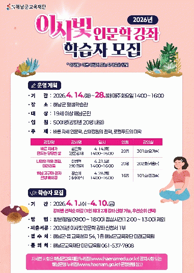 [ÅåÅå´º½º]ÇØ³²±º±³À°Àç´ÜÀº 4¿ù 14ÀϺÎÅÍ 28ÀϱîÁö¡®Çس² ÀÌ»çºû Àι®ÇÐ °Á¡¯¸¦ ¿î¿µÇÑ´Ù.¡®ÀÌ»çºû¡¯Àº¡®À̸¥ ¾ÆÄ§ µû½ºÇÏ°Ô ºñÃß´Â ÇÞºû¡¯À» ÀǹÌÇÏ¸ç µû¶æÇϰí Ä£±ÙÇÑ Àι®ÇÐÀÇ ºûÀ» ÀüÇÏ´Â ±º¹Î ±³À°°úÁ¤ÀÌ´Ù.