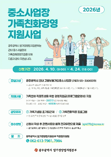 [ÅåÅå´º½º]±¤ÁÖ±¤¿ª½Ã Àϰ¡Á¤¾ç¸³Áö¿øº»ºÎ´Â ¡®2026³â °¡Á·Ä£È°æ¿µ Áö¿ø»ç¾÷¡¯¿¡ Âü¿©ÇÒ Áö¿ª Áß¼Ò»ç¾÷Àå 30°÷À» ¿À´Â 10ÀϺÎÅÍ 24ÀϱîÁö ¸ðÁýÇÑ´Ù.