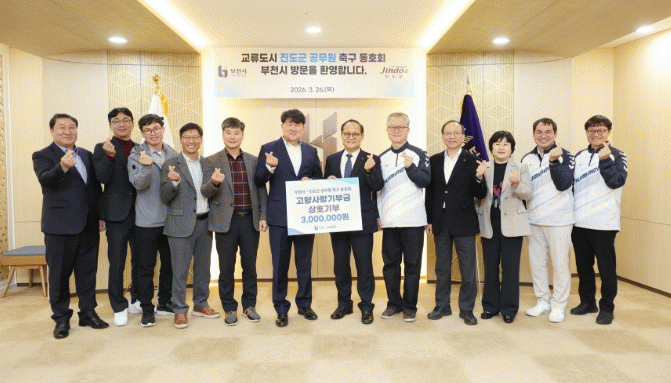 [ÅåÅå´º½º] Áøµµ±º°ú ºÎõ½Ã°¡ Àڸŵµ½Ã °£ ±³·ù¸¦ Ȱ¼ºÈÇϱâ À§ÇØ ÃßÁøÇÑ ¡®Ã౸µ¿È£È¸ Ä£¼± ±³·ù Çà»ç¡¯¿¡¼ °íÇâ»ç¶û±âºÎ±Ý 300¸¸ ¿øÀ» »óÈ£ ±âºÎÇϸç, ¾ç ÁöÀÚü °£ÀÇ Çù·Â °ü°è¸¦ ÇÑÃþ °ÈÇß´Ù.