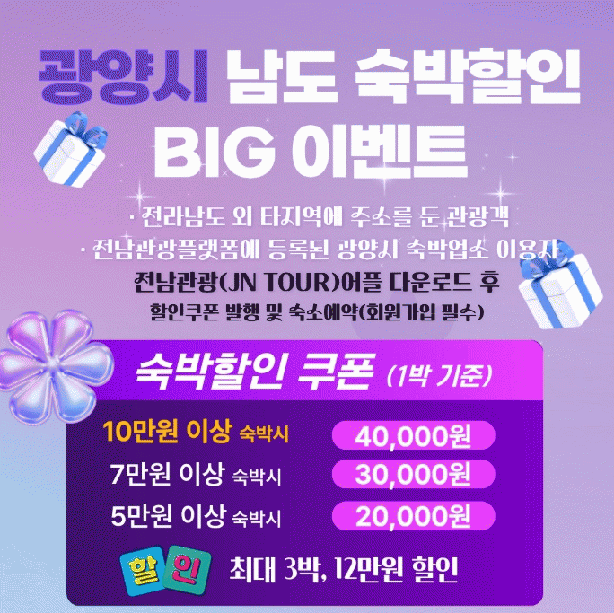 À̹ø À̺¥Æ®´Â Àü¶ó³²µµ¿Í ±¤ÁÖ±¤¿ª½Ã¸¦ Á¦¿ÜÇÑ Áö¿ª¿¡ ÁÖ¼Ò¸¦ µÐ °ü±¤°´ÀÌ Àü³² Áö¿ª ¼÷¹Ú¾÷¼Ò¸¦ ÀÌ¿ëÇÒ °æ¿ì ÇÒÀÎ ÇýÅÃÀ» Á¦°øÇÏ´Â »ç¾÷À¸·Î, 4¿ùºÎÅÍ 11¿ù±îÁö ¿¹»ê ¹üÀ§ ³»¿¡¼ ¿î¿µµÈ´Ù.
