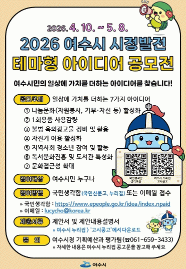 [ÅåÅå´º½º]¿©¼ö½Ã´Â ½Ã¹ÎµéÀÇ Âü½ÅÇϰí âÀÇÀûÀÎ ÀǰßÀ» Á¤Ã¥¿¡ ¹Ý¿µÇØ ¡®½Ã¹ÎÀÌ Âü¿©ÇÏ´Â ½ÃÁ¤¡¯À» ½ÇÇöÇϰíÀÚ ¿À´Â 4¿ù 10ÀϺÎÅÍ 5¿ù 8ÀϱîÁö ¡®2026³â ¿©¼ö½Ã ½ÃÁ¤¹ßÀü Å׸¶Çü ¾ÆÀ̵ð¾î °ø¸ðÀü¡¯À» ½Ç½ÃÇÑ´Ù°í ¹àÇû´Ù.