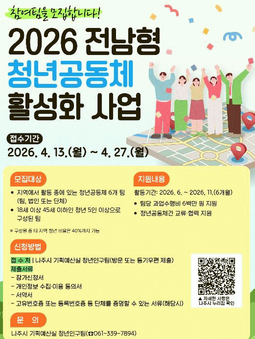 [ÅåÅå´º½º]Àü³² ³ªÁֽô 10ÀÏ Ã»³âµéÀÇ Áö¿ª Ȱµ¿ ±â¹Ý ¸¶·Ã ¹× Áö¿ª Ȱ¼ºÈ¸¦ µµ¸ðÇϱâ À§ÇØ ¡®2026³â û³â°øµ¿Ã¼ Ȱ¼ºÈ »ç¾÷¡¯¿¡ Âü¿©ÇÒ ÆÀÀ» ¸ðÁýÇÑ´Ù°í ¹àÇû´Ù.
