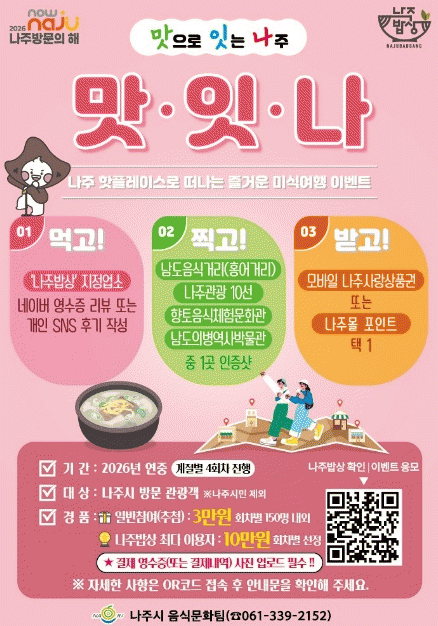 [ÅåÅå´º½º]Àü³² ³ªÁֽð¡ ¡®2026 ³ªÁֹ湮ÀÇ ÇØ¡¯¸¦ ¸Â¾Æ ½Ã ´ëÇ¥ À½½Ä ºê·£µåÀÎ ¡®³ªÁÖ¹ä»ó¡¯À» ¾Õ¼¼¿î »ç°èÀý ¹Ì½Ä À̺¥Æ® ¡®¸ÀÀ¸·Î ÀÕ´Â ³ªÁÖ, ¡®¸ÀÀÕ³ª¡¯ÀÇ 2ȸÂ÷(º½) ¿î¿µÀ» º»°ÝÀûÀ¸·Î ½ÃÀÛÇÑ´Ù.