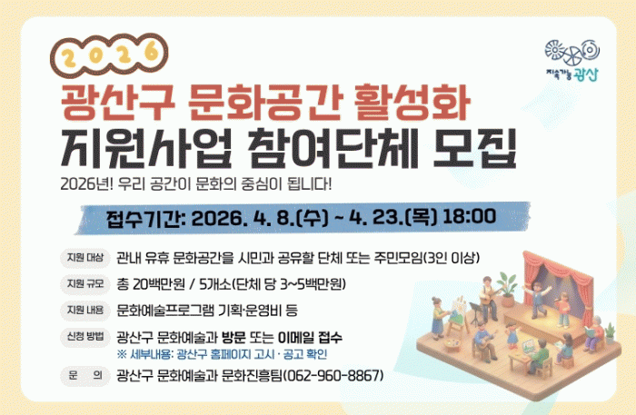 [ÅåÅå´º½º]±¤ÁÖ ±¤»ê±¸°¡ Áö¿ª À¯ÈÞ ¹®È°ø°£À» ¿¸° ½Ã¹Î ¹®È °ÅÁ¡À¸·Î Ȱ¿ëÇÏ´Â ¡®2026³â ¹®È°ø°£ °øÀ¯ Ȱ¼ºÈ Áö¿ø»ç¾÷¡¯À» ÃßÁøÇÑ´Ù.