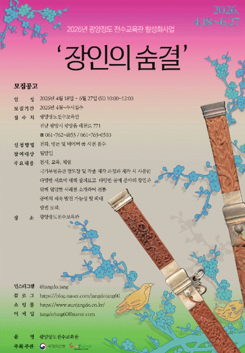 [ÅåÅå´º½º] ±¤¾çÀåµµÀü¼ö±³À°°üÀº ±¹°¡À¯»êû°ú ±¤¾ç½Ã°¡ ÁÖÃÖÇÏ´Â '2026³â ±¤¾çÀåµµÀü¼ö±³À°°ü Ȱ¼ºÈ »ç¾÷'ÀÇ Çϳª·Î ¿À´Â 4¿ù 18ÀϺÎÅÍ 6¿ù 27ÀϱîÁö ¸ÅÁÖ Åä¿äÀÏ ¡®ÀåÀÎÀÇ ¼û°á¡¯ ÇÁ·Î±×·¥À» ¿î¿µÇÑ´Ù°í ¹àÇû´Ù.