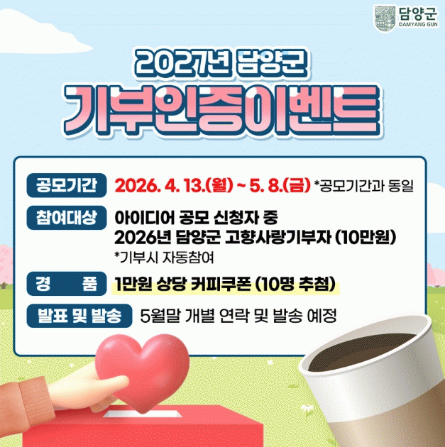 ¿ì¼ö Á¦¾ÈÀÚ¿¡°Ô´Â ÃÑ 100¸¸ ¿øÀÇ ´ã¾ç»ç¶û»óǰ±ÇÀÌ Áö±ÞµÇ¸ç, ÃÖ¿ì¼ö»ó 1¸í(30¸¸ ¿ø), ¿ì¼ö»ó 2¸í(°¢ 20¸¸ ¿ø), Àå·Á»ó 3¸í(°¢ 10¸¸ ¿ø)À» ¼±Á¤ÇÑ´Ù. ¼±Á¤µÈ ¾ÆÀ̵ð¾î´Â ÇâÈÄ ´ã¾ç±º °íÇâ»ç¶û±âºÎÁ¦ Á¤Ã¥ ¹× ±â±Ý¿î¿ë°èȹ ¼ö¸³¿¡ Àû±Ø ¹Ý¿µµÉ ¿¹Á¤ÀÌ´Ù.