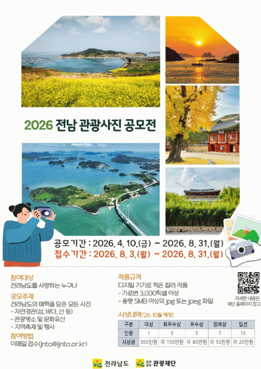 [ÅåÅå´º½º] Àü¶ó³²µµ´Â ÀÚ¿¬°æ°ü°ú °ü±¤Áö, ÃàÁ¦ µî Áö¿ªÀÇ ´Ù¾çÇÑ ¸Å·ÂÀ» ³Î¸® ¾Ë¸®°í ¼öÁØ ³ôÀº »çÁø ÄÜÅÙÃ÷¸¦ ¹ß±¼Çϱâ À§ÇØ ¡®2026³â Àü³² °ü±¤»çÁø °ø¸ðÀü¡¯À» ÃßÁøÇÑ´Ù.