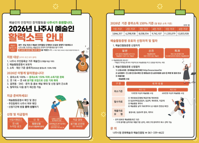[ÅåÅå´º½º]Àü³² ³ªÁֽð¡ Áö¼Ó °¡´ÉÇÑ ¹®È¿¹¼ú »ýŰè Á¶¼ºÀ» À§ÇØ ¡®2026³â 2ºÐ±â ¿¹¼úÀΠȰ·Â¼Òµæ Áö¿ø±Ý¡¯ ½ÅûÀ» ¿À´Â 5¿ù 19ÀϱîÁö Á¢¼öÇÑ´Ù.